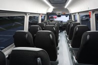 Passagerarstolar med 3-punktsbälte, klädda i tyg, nackstöd i skinn, armstöd mot mittgången, handtag på ryggstöd
