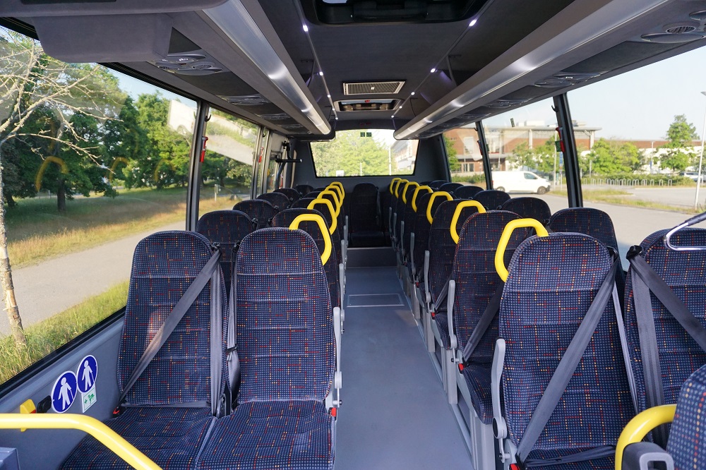 Antal sittande passagerare: 30 st., stolar med 3-punktsbälte, handtag mot mittgången, stolar täckta i tyg, tyg på baksidan, fällbar armstöd mot mittgången, justerbara ryggstöd