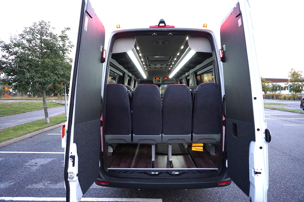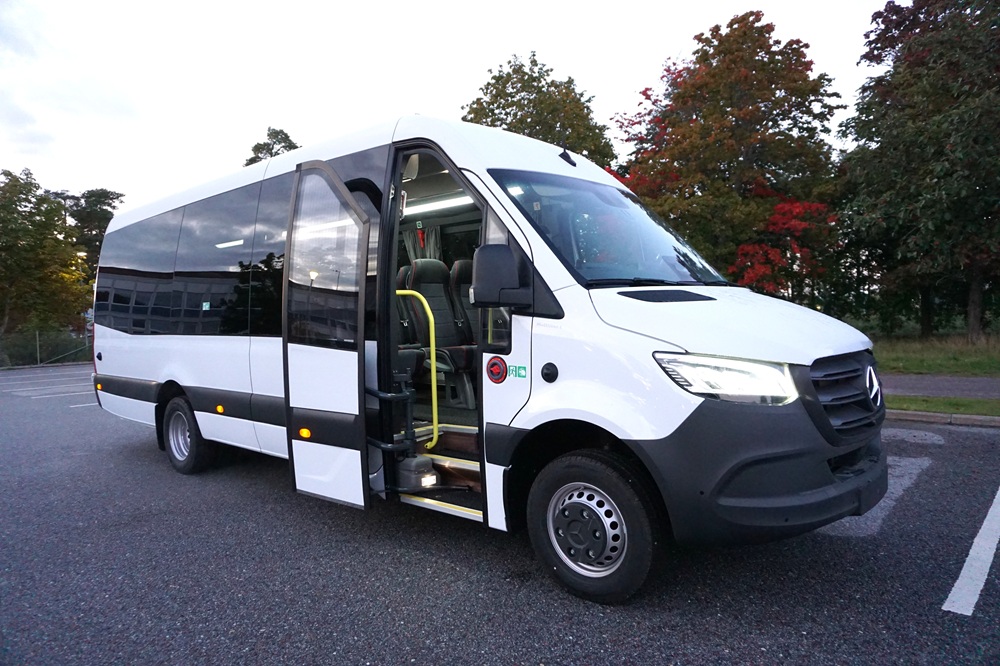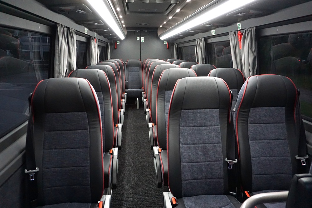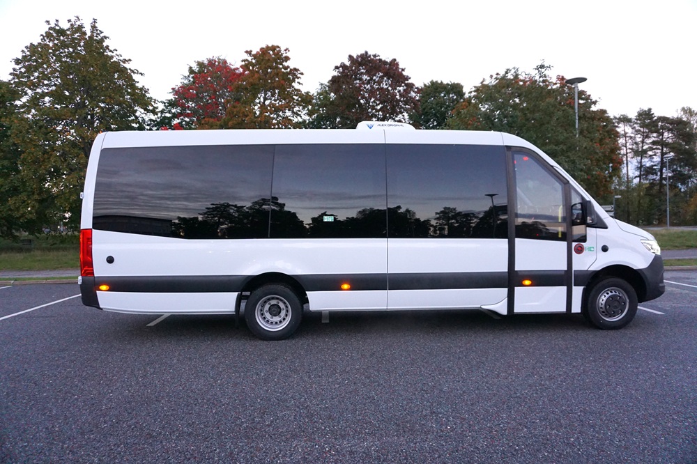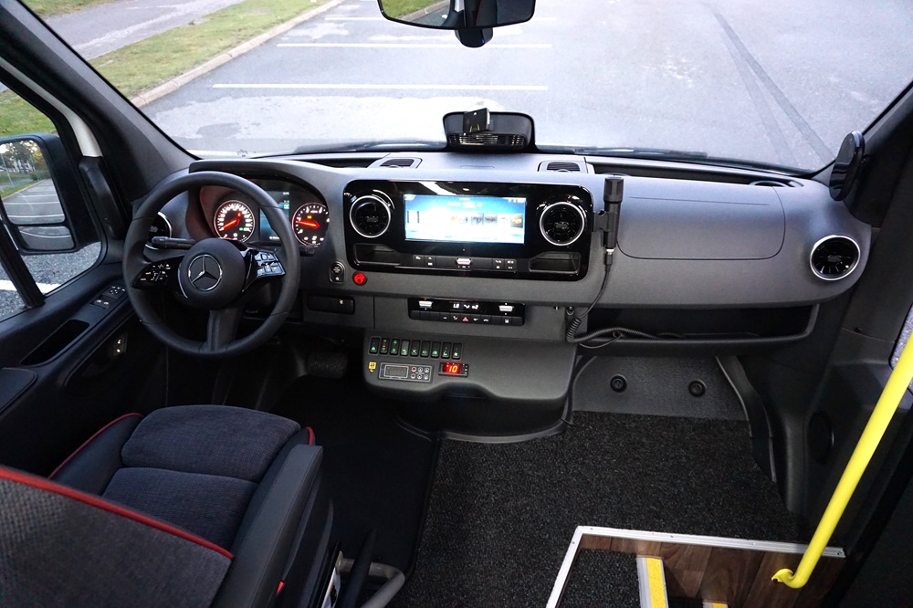 Elstyrd bussdörr, invändig takfläkt i passagerarutrymmet, LED dag- och nattbelysning i taket, gardiner