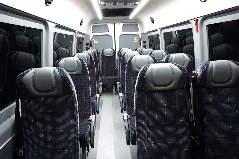Passagerarstolar med 3-punktsbälte, klädda i tyg, nackstöd i skinn, armstöd mot mittgången, handtag på ryggstöd