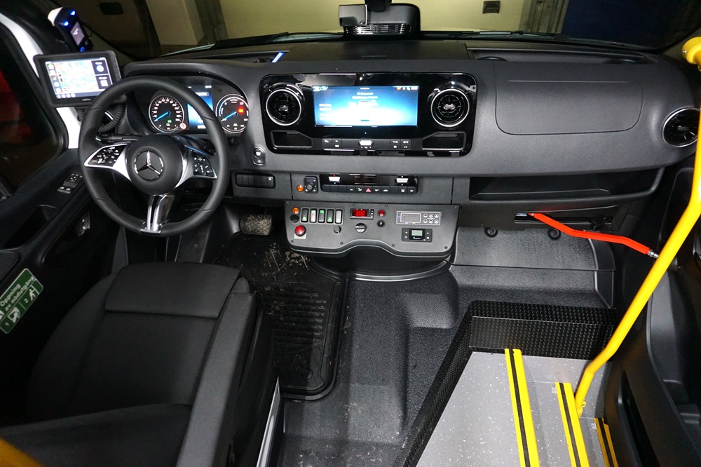 Skolskyltar LED, backvarnare, tonade sidorutor, nödutgångslucka. Fordon utrustas med glashammare, bälteskniv, handbrandsläckare, förbandslåda. Batteriladdare